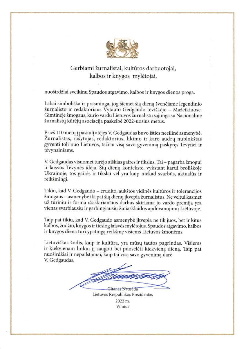 Gegužės 7-ąją – Spaudos atgavimo, kalbos ir knygos dieną Mažeikiuose įteikta legendinio žurnalisto ir redaktoriaus Vytauto Gedgaudo premija. Ši garbinga premija šiemet skirta Audronei Kosciuškienei ir Justinui Lingiui už TV laidų ciklą „Viltis abipus Atlanto“.